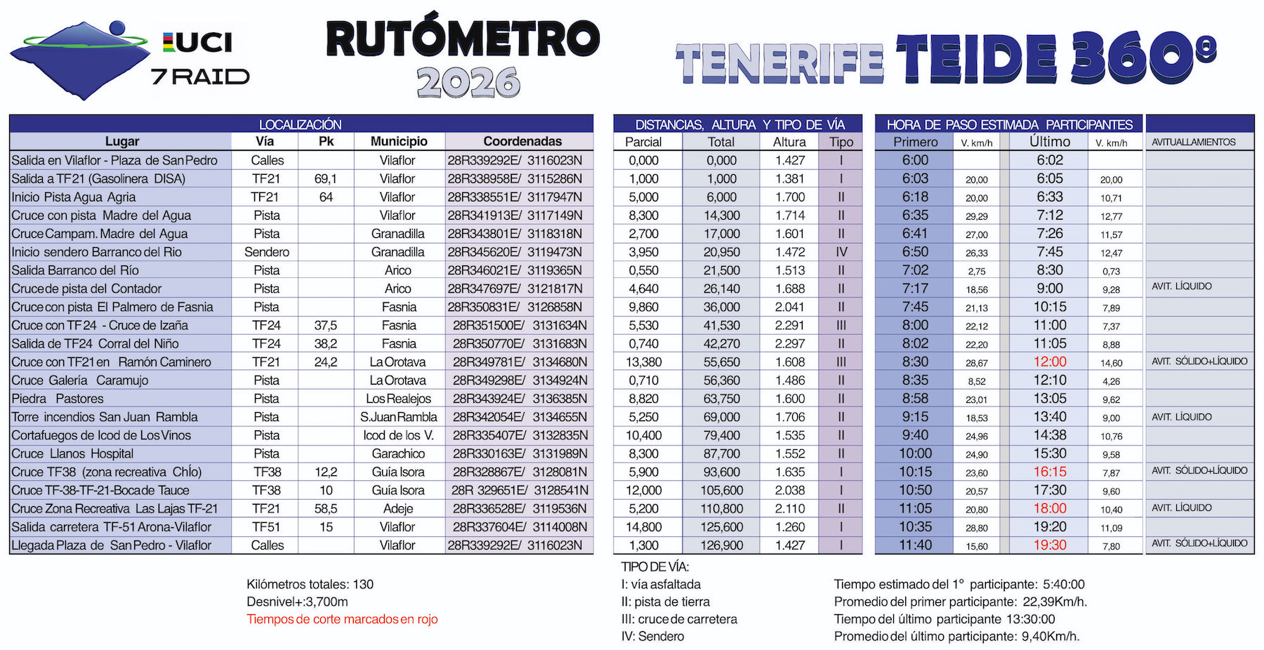 "Discurre principalmente por pistas de tierra en un estado aceptable, algún tramo de camino que se tiene que hacer obligatoriamente bajado de la bici y algún tramo de carretera asfaltada, que permitan dar la vuelta al Teide en bicicleta de montaña."